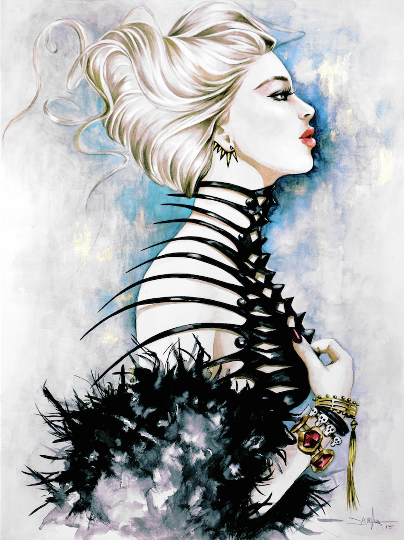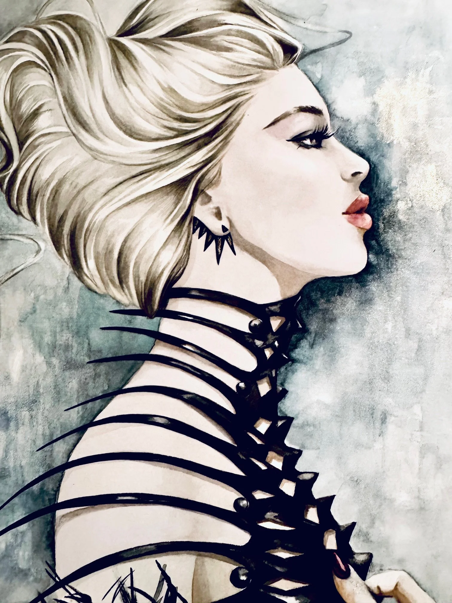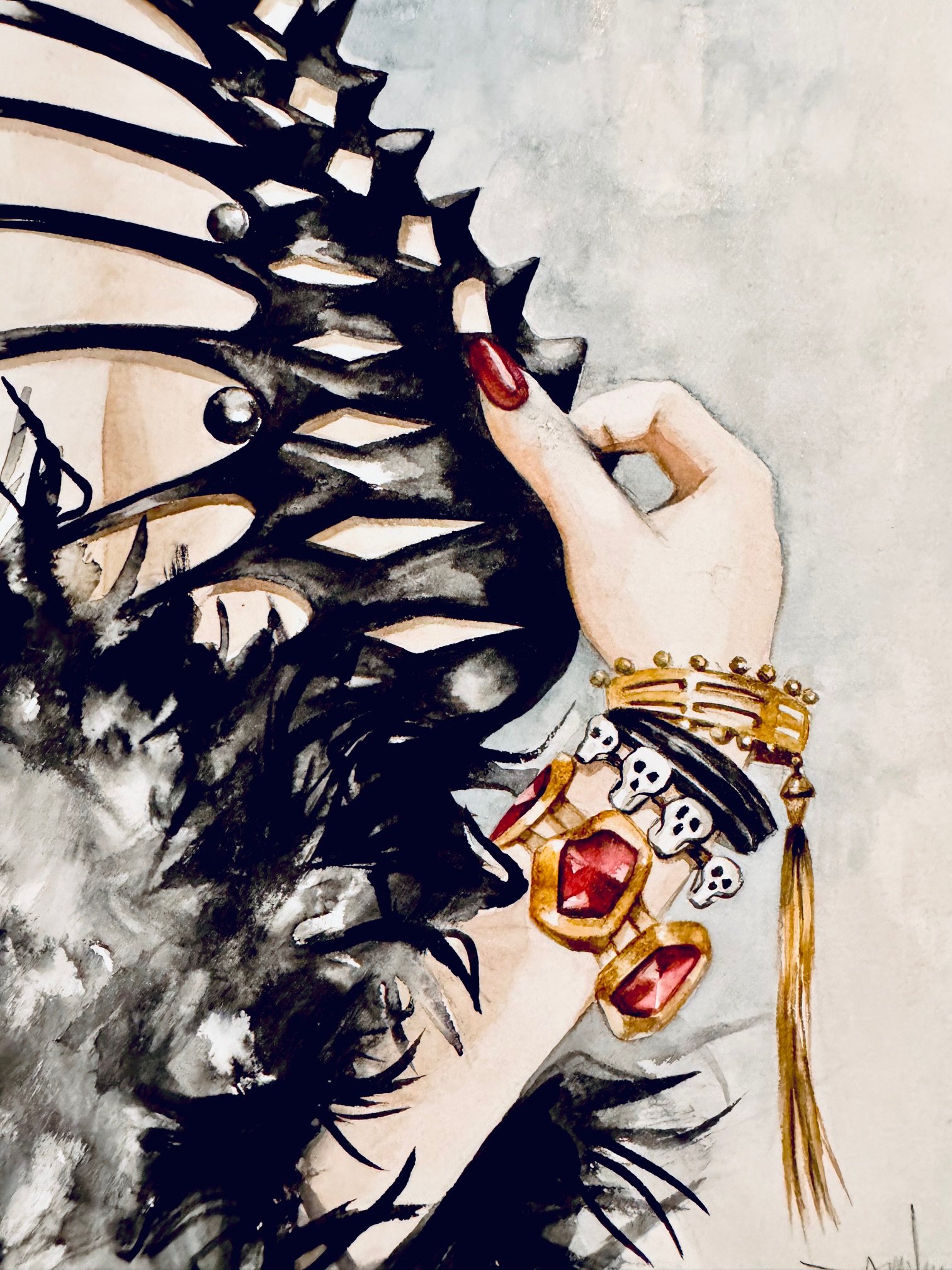 “Couture” is a 22 × 30” watercolor airbrush painting on acid free archival illustration board with hand accented details, including metallic gold.