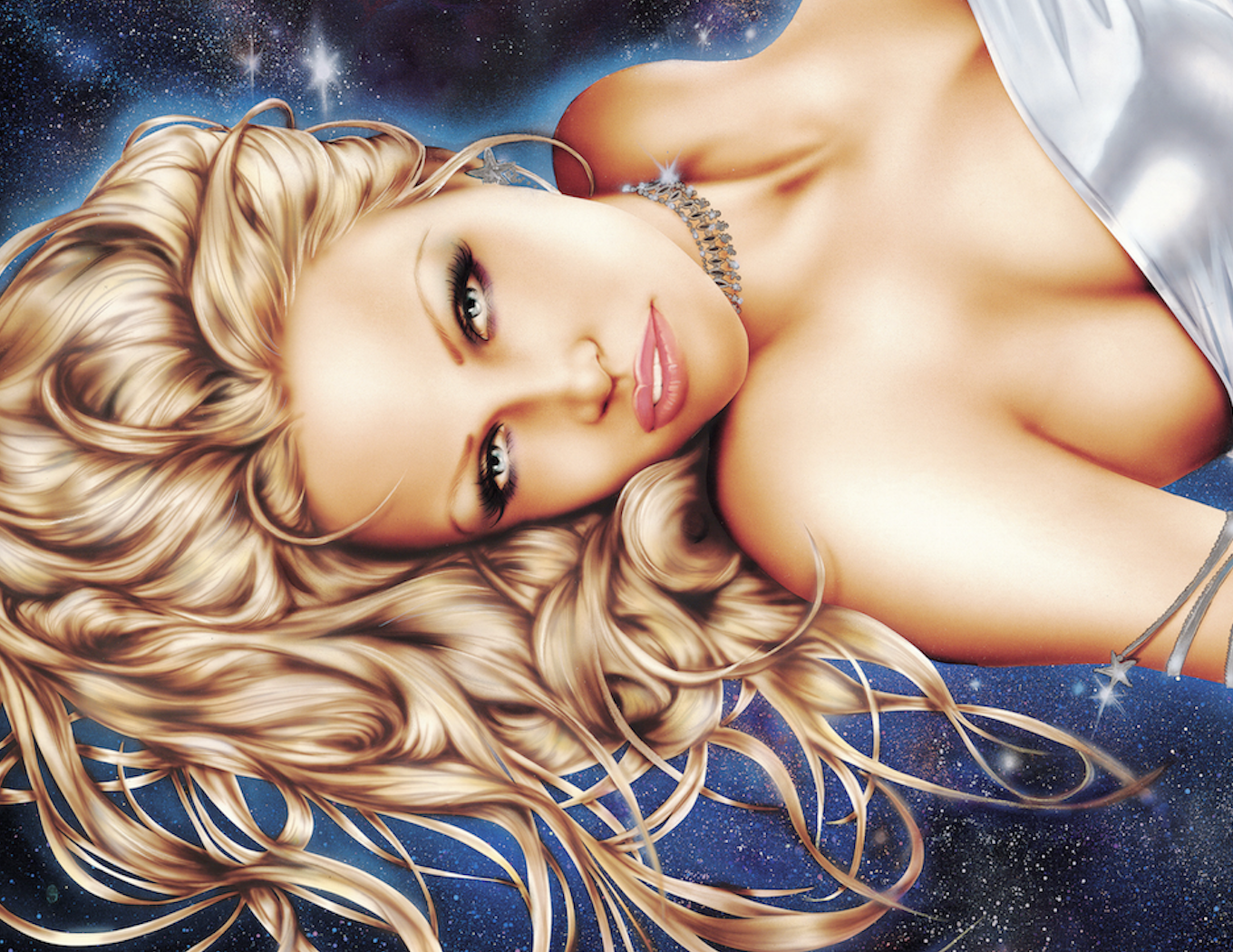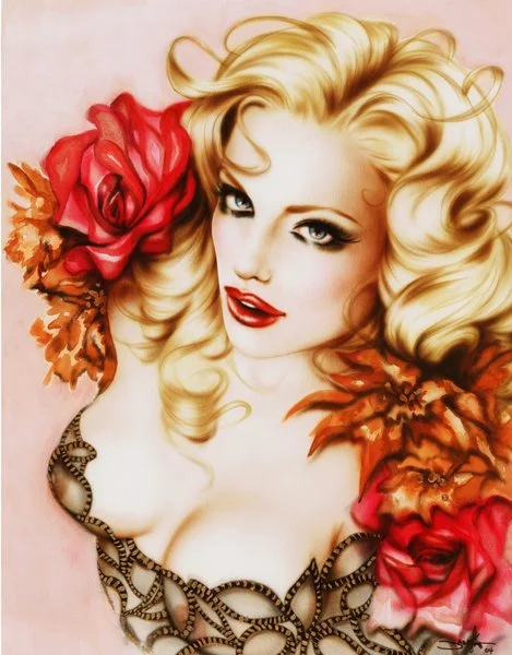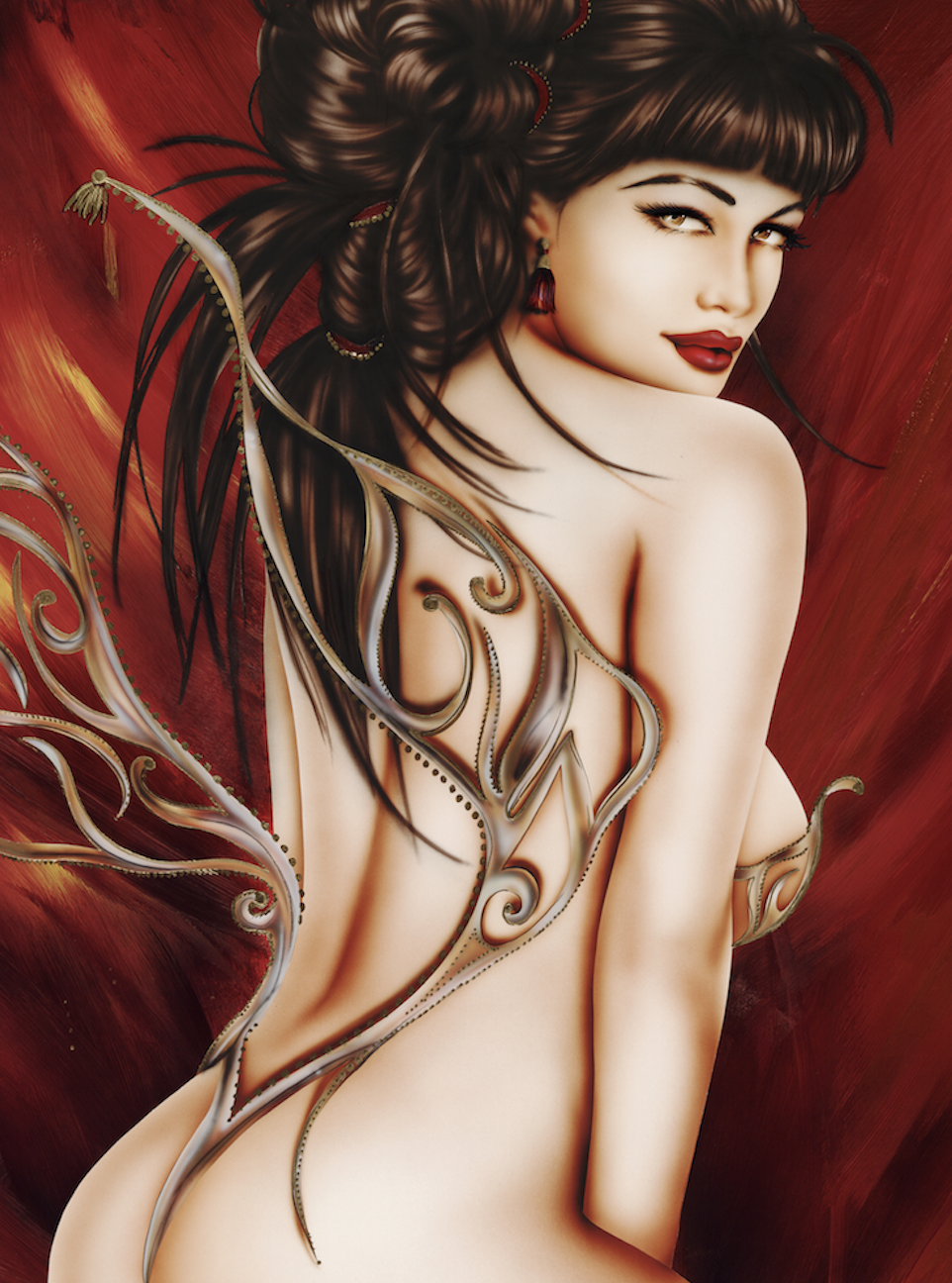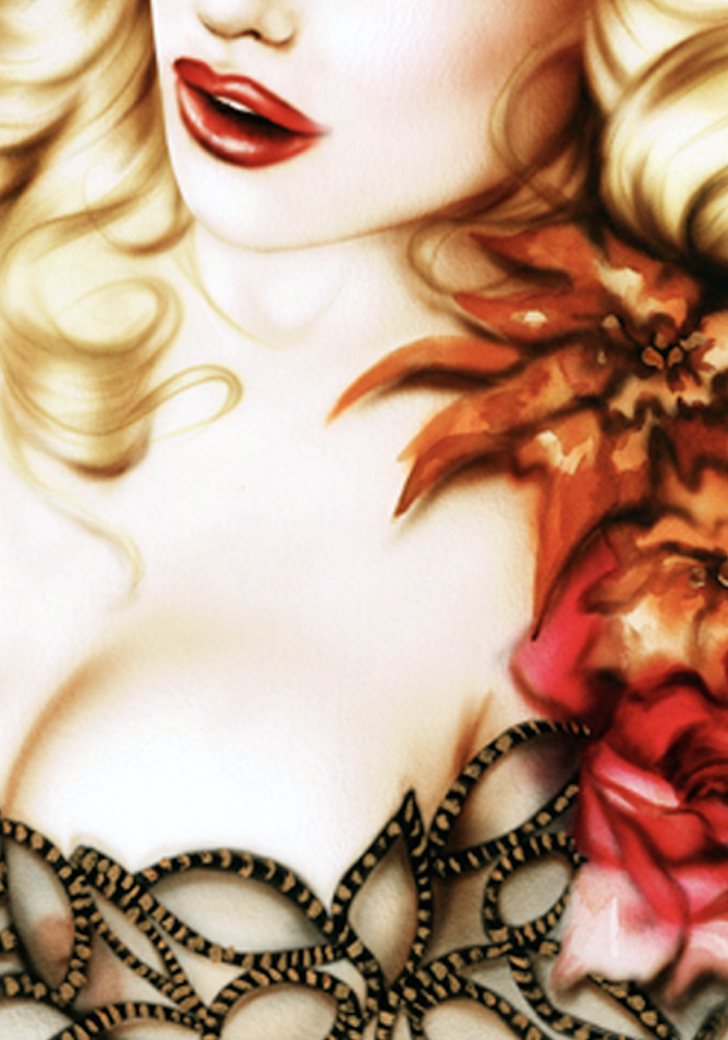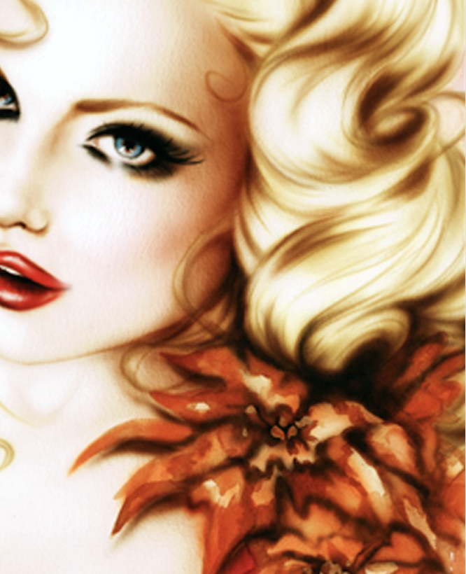 “Couture” is a 22 × 30” watercolor airbrush painting on acid free archival illustration board with hand accented details, including metallic gold.